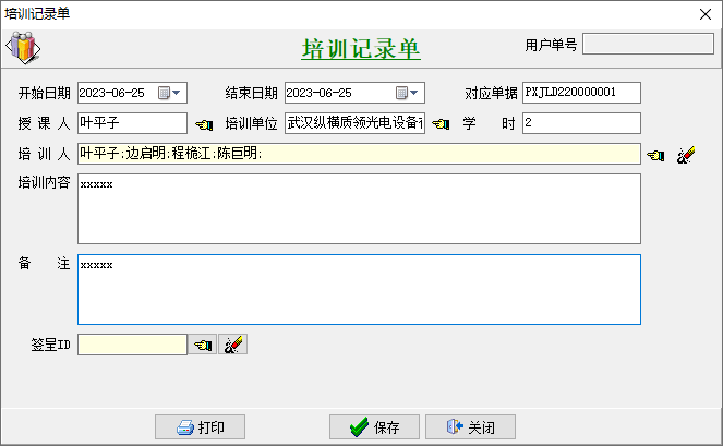 【培訓(xùn)記錄單】旨在記錄員工培訓(xùn)的單據(jù),包括授課人、培訓(xùn)單位、學(xué)時、培訓(xùn)人、培訓(xùn)主題和備注等。如下圖所示: