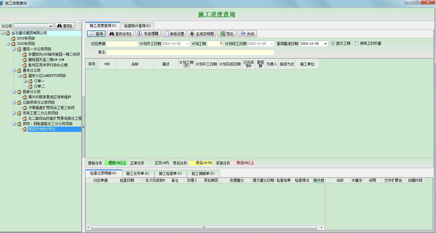軟件提供施工進(jìn)度在線查詢功能,可以查詢項(xiàng)目進(jìn)展開(kāi)工日期、計(jì)劃完工日期、已完成、里程碑、指派人等信息,并可以通過(guò)顏色予以標(biāo)記項(xiàng)目的進(jìn)展變化、具體信息。