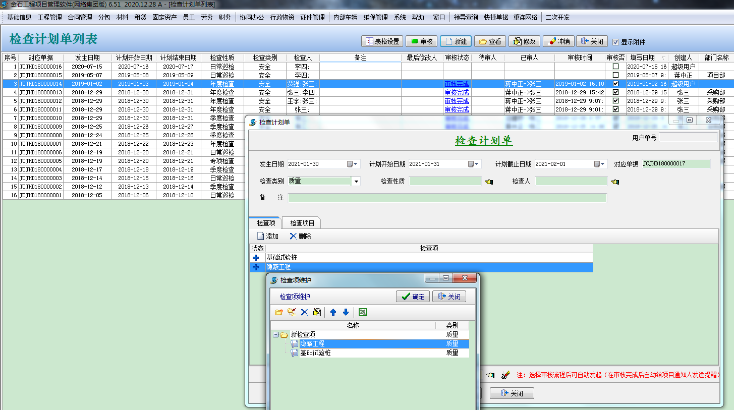 項目的安全檢查可以通過檢查計劃單完成,首先用戶可以選中對應項目新建檢查單,并通過預設的檢查項目規劃檢查計劃,滿足相應的日常巡檢、年度檢查、季度檢查需求。