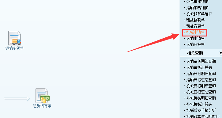 【租賃管理】右側黑體字“相關查詢”下方【機械申請單】(如下圖)