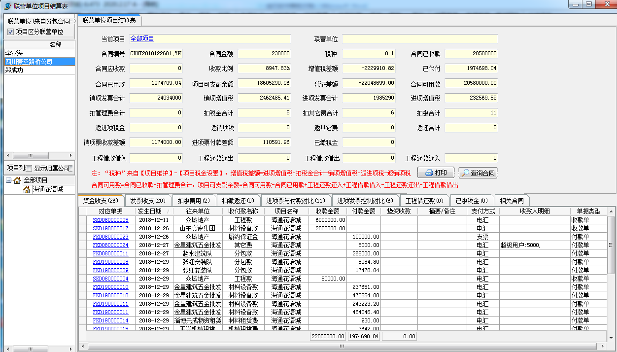 聯(lián)營項目的所有資金收支、發(fā)票收支、扣繳費用、扣繳返還、發(fā)票進項與銷項對比、進項發(fā)票控制對比、工程借還款信息都可以在本報表內(nèi)顯示并匯總,通過該單據(jù)可以全面了解聯(lián)營項目的結算相關信息。