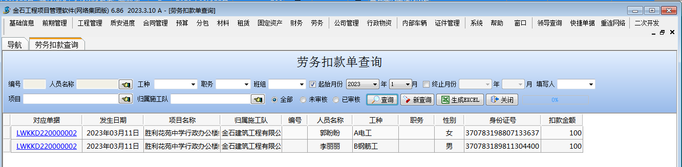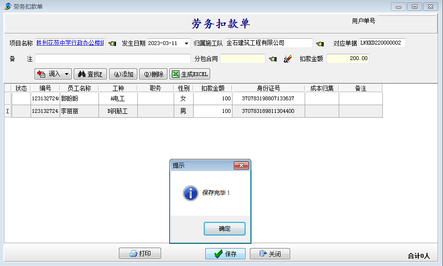 【勞務扣款單】用來記錄勞務人員扣款的情況,可生成在工資表中。