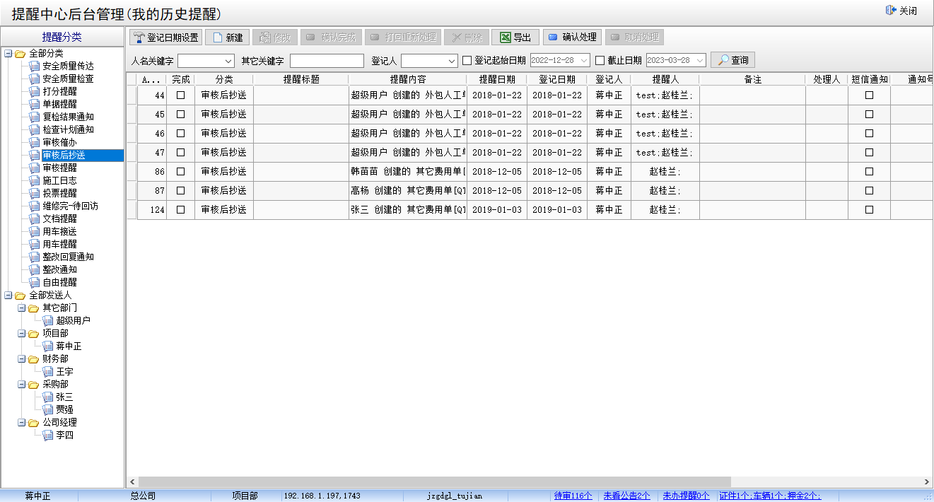 消息中心匯總顯示當前用戶收到的各類消息,如新聞公告、我收到的提醒、我發出的提醒、證件提醒、車輛提醒、押金提醒和合同原件接收提醒等。