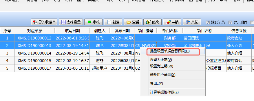 單據填寫完成后,可以按住ctrl/shift 選擇多條項目信息,點擊鼠標右鍵,批量設置單據查看權限,如下圖:
