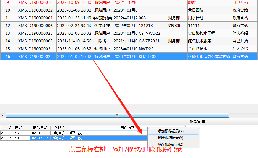 在【項目收集單】列表中,選中跟蹤的項目,在下面跟蹤記錄處,點擊鼠標右鍵,添加/修改/刪除跟蹤記錄,具體操作如下圖:
