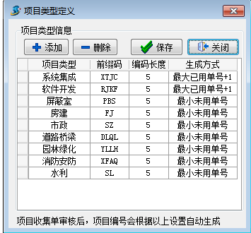 在[前期管理]--[項目收集相關信息維護]-[項目收集類型維護]中,添加項目類型定義,設置前綴碼、編碼長度及生成方式,項目收集單審核后,項目編號會根據以上設置自動生成。