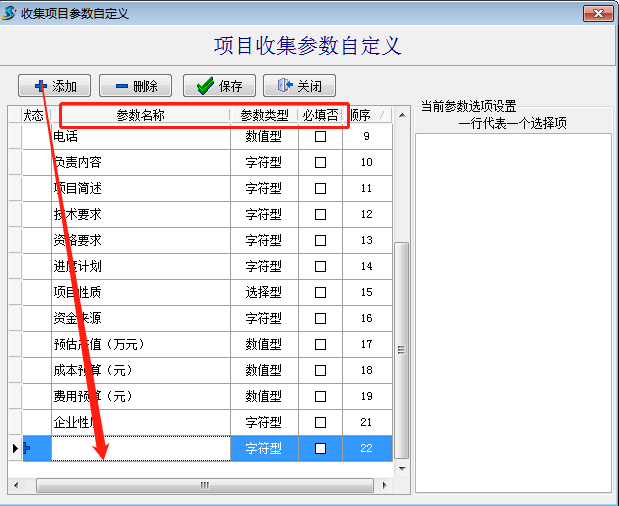 在[前期管理]--[項目收集相關信息維護]-[項目收集參數自定義]中,點擊[添加]新增項目收集的參數,輸入參數名稱,選擇參數類型,確定好字段是否為必填字段,如下圖: