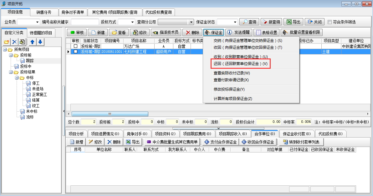 我方要從“保證金管理單位”將投標保證金收回。工程管理軟件的項目開拓中選中對應的項目,在“保證金”菜單中選擇“收回”,如圖所示: