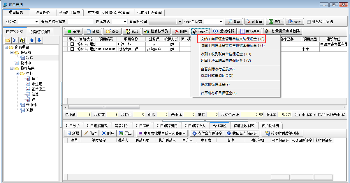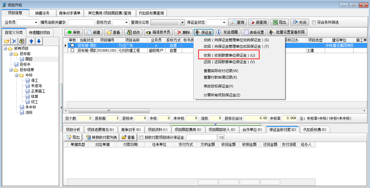 1收到-投標保證金掛靠單位將投標保證金交給我方。我方在工程項目管理軟件的項目開拓列表中找到對應項目,在“保證金”菜單中點擊“收到”,如圖: