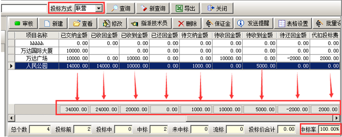 5項目開拓中查詢投標保證金在工程管理軟件項目開拓列表中可以查詢多個項目投標保證金的九項合計,如圖所示:也可根據投標方式、業務員、項目狀態查詢。
