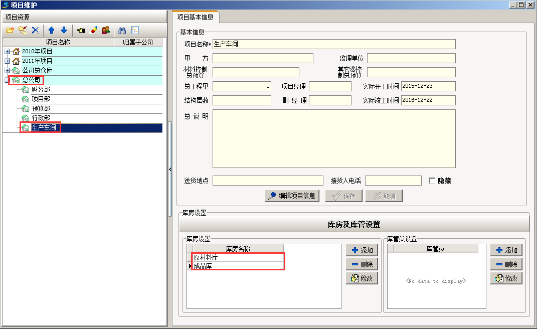 想要進行生產管理,需要首先在“工程管理”的“項目維護”中,在公司節點下建立“生產車間”并設立對應庫房,這樣便于對用于生產的原材料或者產品進行管理。如圖: