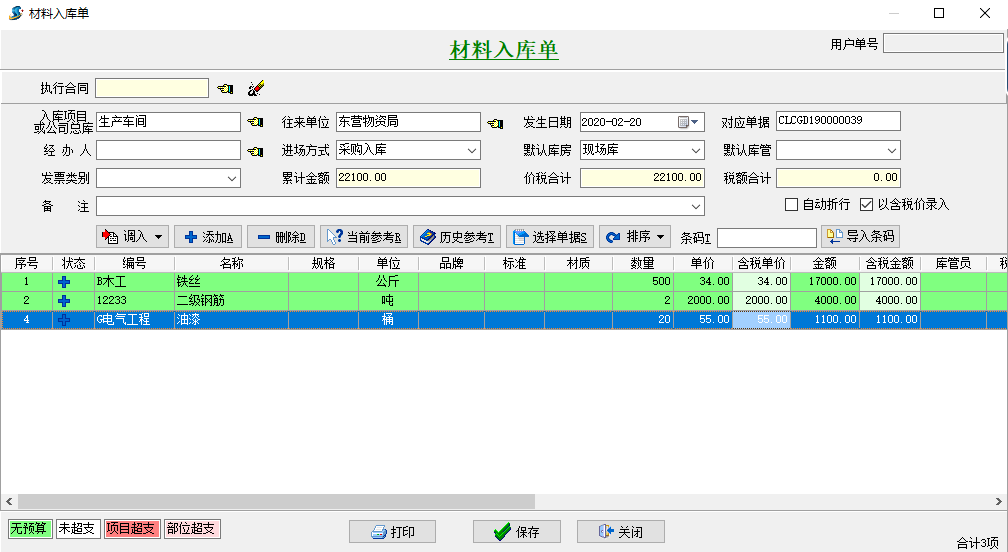 采購原材料到庫房做材料采購單,入庫庫房選擇剛生產車間的庫房。如圖:
