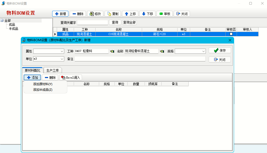點擊新增可以添加成品材料或者半成品材料配比信息。