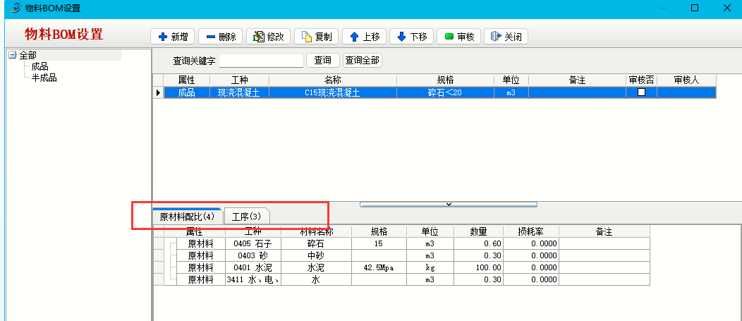 其中成品材料配比中可以是半成品或者原材料。半成品配比只能是原材料,不能添加半成品。