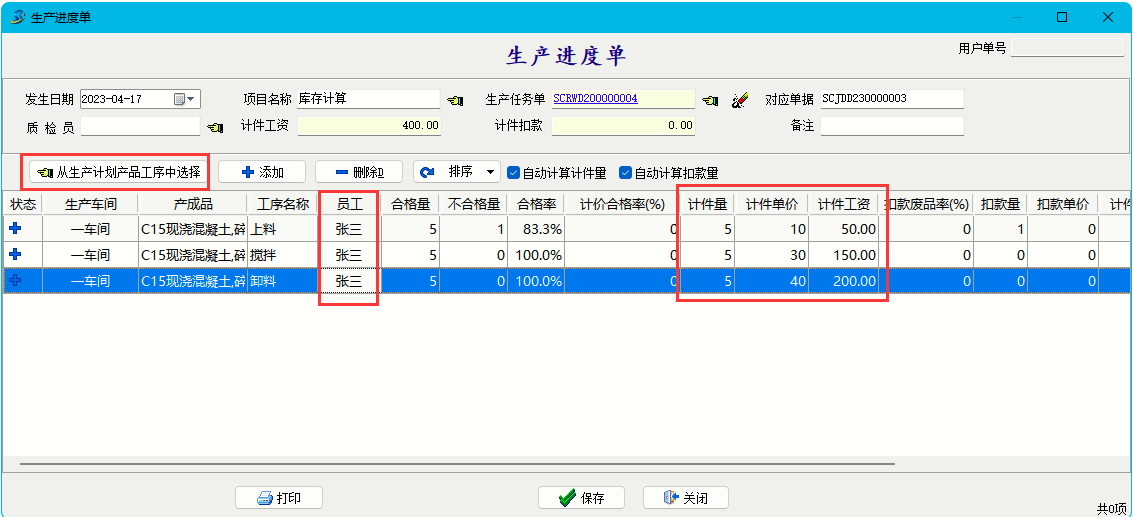 【生產(chǎn)進(jìn)度單】用于根據(jù)工序填報(bào)生產(chǎn)進(jìn)度情況,并可以記錄員工計(jì)件工資。