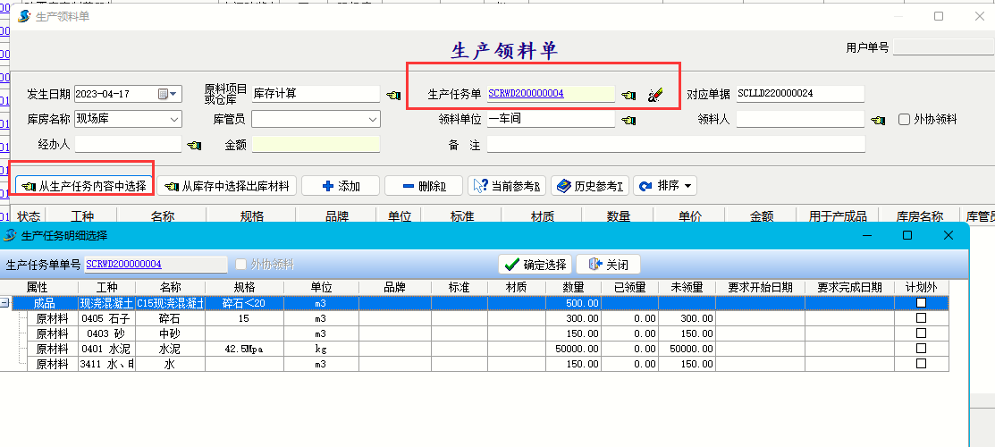新建生產(chǎn)領(lǐng)料單,選擇項(xiàng)目和生成任務(wù)單號(hào),領(lǐng)料明細(xì)可以從生產(chǎn)任務(wù)中選擇。