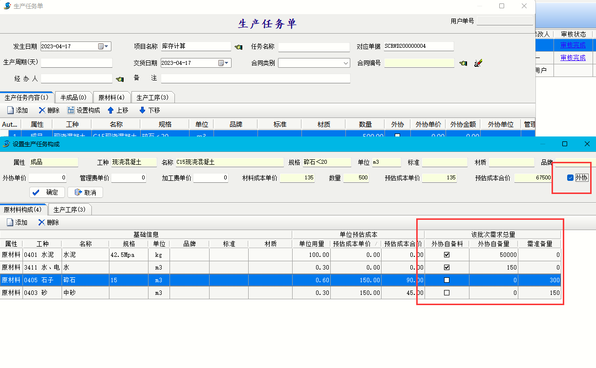 選擇需生產(chǎn)的材料后可以點擊設(shè)置構(gòu)成,設(shè)置配比及工序信息。在原材料構(gòu)成這里可以設(shè)置預(yù)估成本單價和查看原材料需求總量。