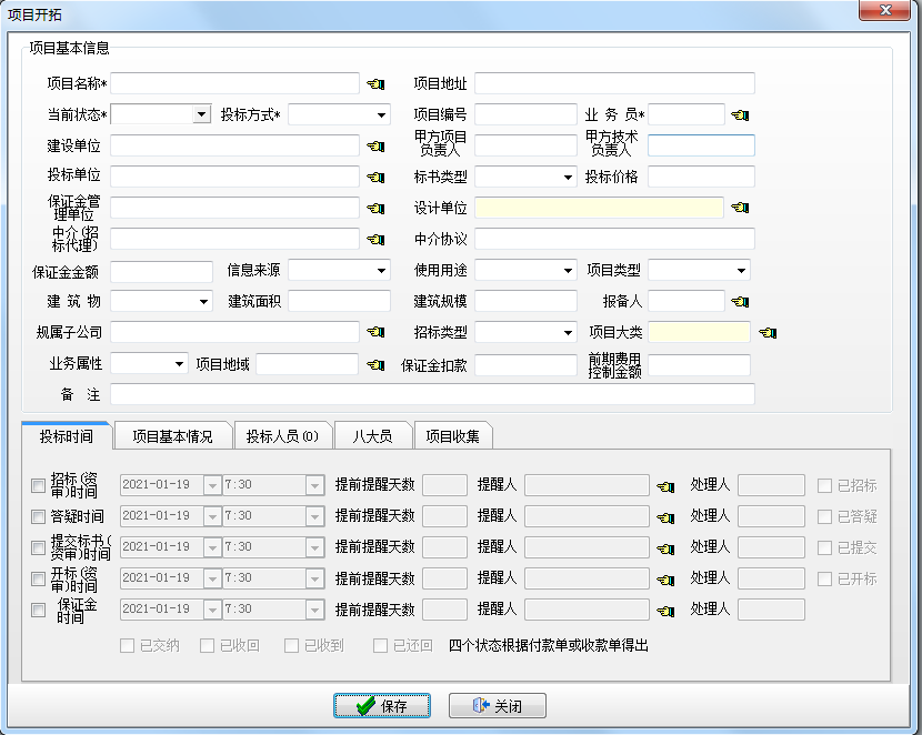 項(xiàng)目投標(biāo)前,需要在模塊選擇新項(xiàng)目建立,在此填報(bào)項(xiàng)目的基本信息,包括項(xiàng)目名稱、當(dāng)前狀態(tài)、項(xiàng)目地址、建設(shè)單位、投標(biāo)單位、保證金管理單位、歸屬子公司、招標(biāo)各環(huán)節(jié)相關(guān)時(shí)間、提醒人、八大員、投標(biāo)人員、項(xiàng)目收集信息等。