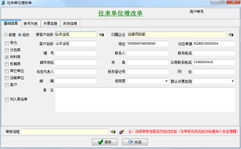 金石軟件增加往來單位增改單,可用于添加往來單位并可以進行流程審批