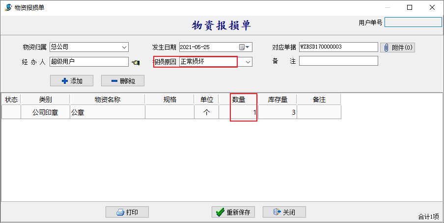 【物資報損單】是用來報損行政物資的業務單據。類似【材料報損單】或者【設備報損單】,一個是針對行政物資報損,一個是針對材料或者設備報損。