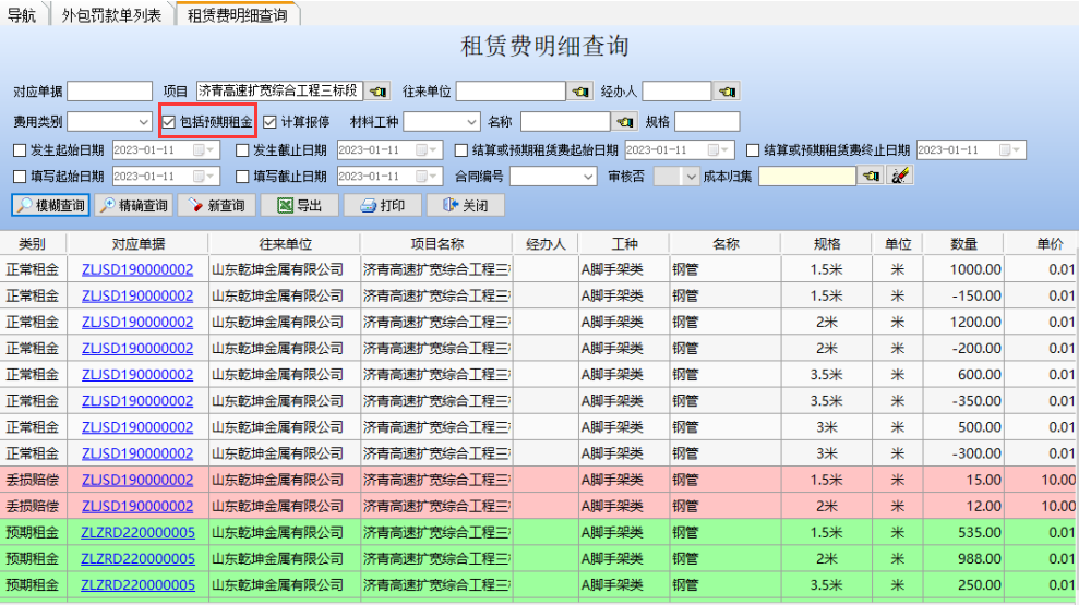 (1)租賃周轉(zhuǎn)材料預(yù)期租金查詢主要通過(guò)【租賃明細(xì)查詢】來(lái)實(shí)現(xiàn),勾選[包括預(yù)期租金]可計(jì)算未生成結(jié)算的預(yù)期租費(fèi),如下圖所示綠色區(qū)域: