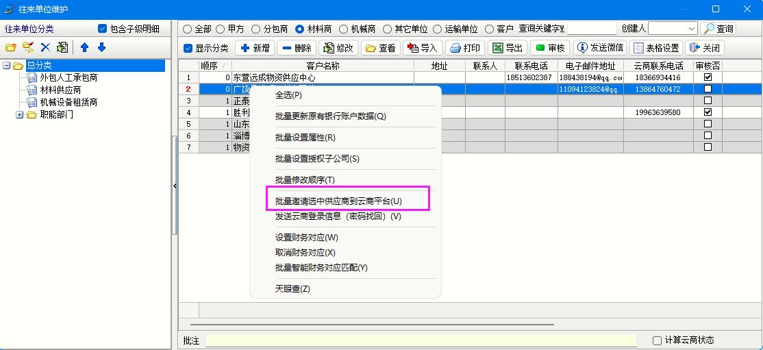 公司注冊需要聯系我公司,由我公司提供注冊碼注冊。公司注冊完成之后,可以針對往來單位進行注冊。點開【基礎信息】-【往來單位維護】,填寫云商聯系電話,然后審核往來單位信息