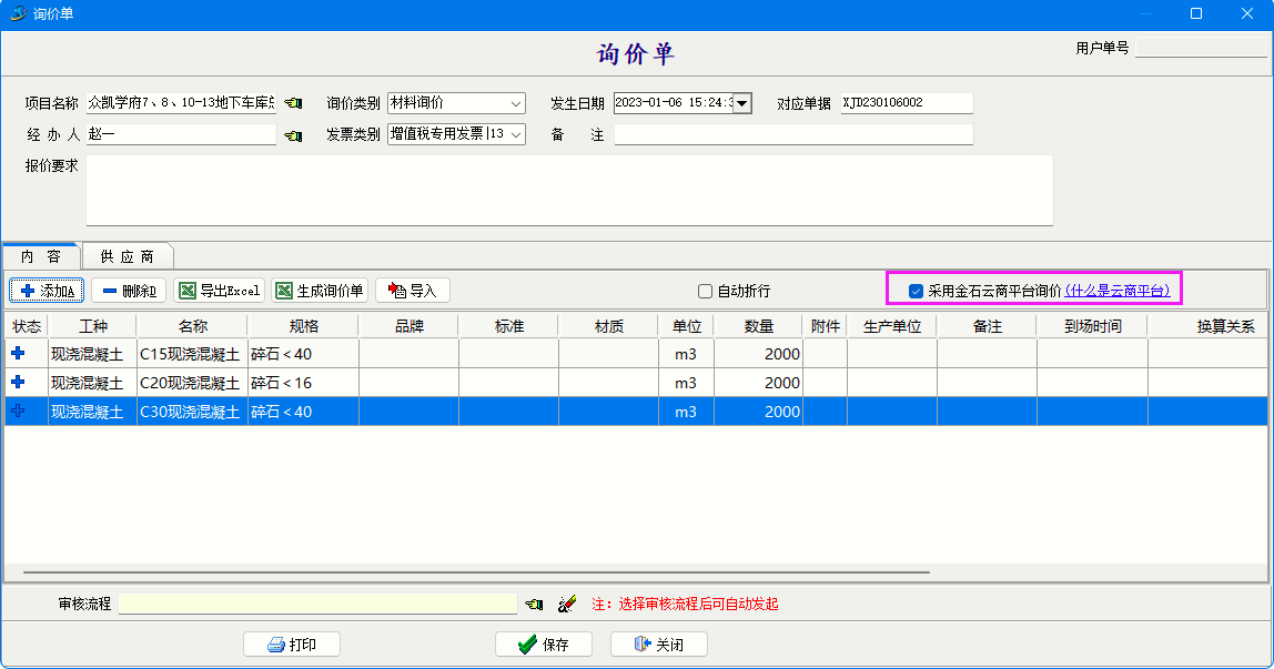 供應商注冊完成后,就可以采用云商報價平臺報價。新建詢價單時選擇[采用金石云商平臺詢價]