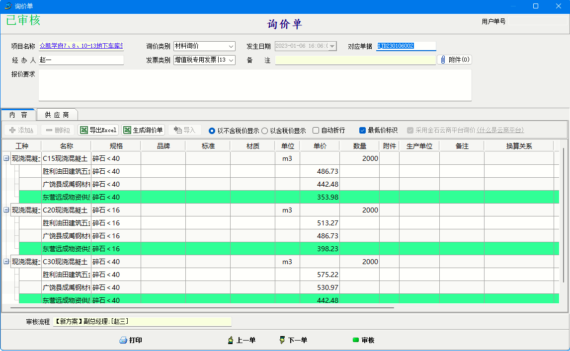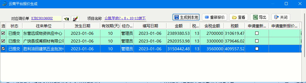 系統顯示供應商報價結果,可以點擊生成到本地,還可以讓供應商重新報價。