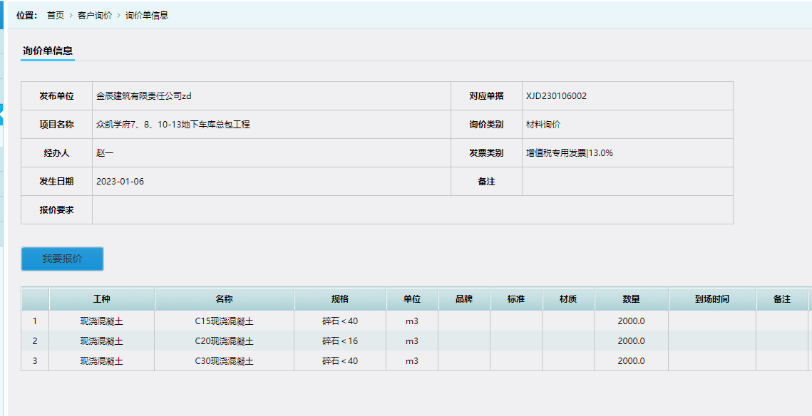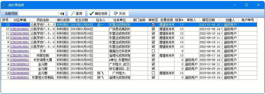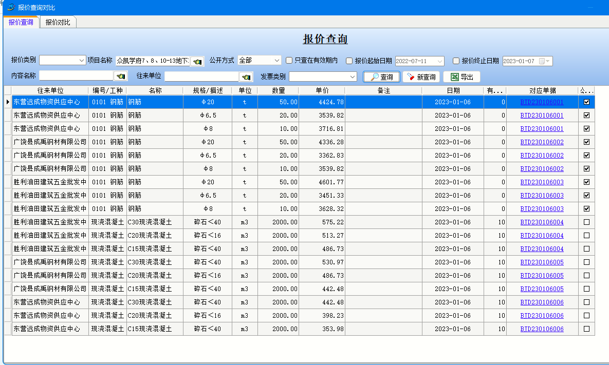報價查詢可以按照項目、時間、具體材料篩選報價信息。