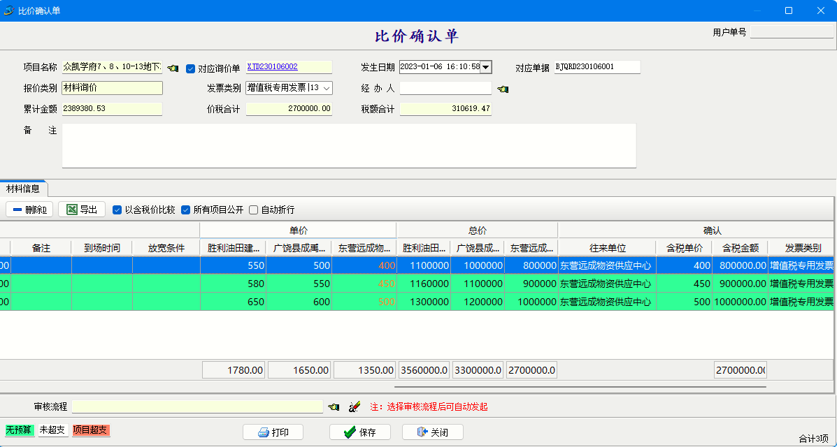 系統會把最低供應商報價顯示為橘黃色,在確認處選擇需要供貨的供應商。
