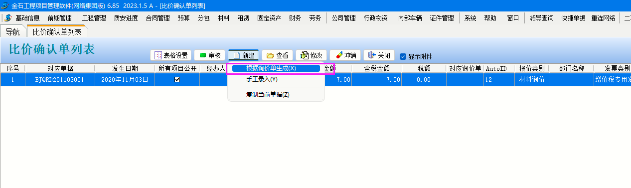 詢價報價完成之后可以進行比價,進入比價確認單列表,點擊新建,選擇根據詢價單生成。