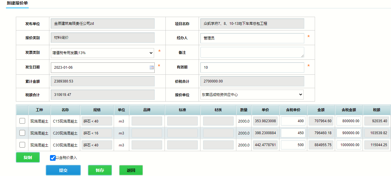 施工企業在購買材料時需要詢價報價,采用現場報價或者紙質文件報價非常不方便,為了施工企業更高效辦公,金石軟件專門研發了金石云商報價平臺,讓施工企業和供應商實現線上詢價報價無需直接接觸。金石云商報價平臺通過短信可以實現信息相互傳達,收到信息后供應商可以通過多種途徑實現報價,可以在電腦、手機、平板等設備直接操作報價。