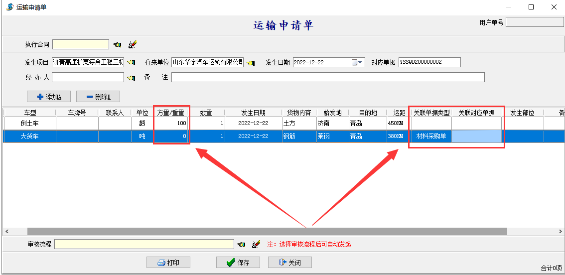 單據用法:主要填寫項①本單有兩個量,“數量”為申請幾臺車;“方量、重量”為輔助核算量②車輛單可關聯其他單據,通過選擇“關聯單據類型”后選擇 “關聯對應單據”(如下圖)