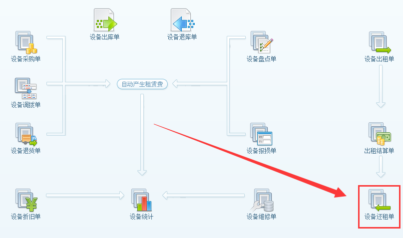 應(yīng)用場(chǎng)景:【設(shè)備還租單】用于設(shè)備出租后與對(duì)方單位的結(jié)算,如設(shè)備長(zhǎng)期租賃未還租,本單可多次生成