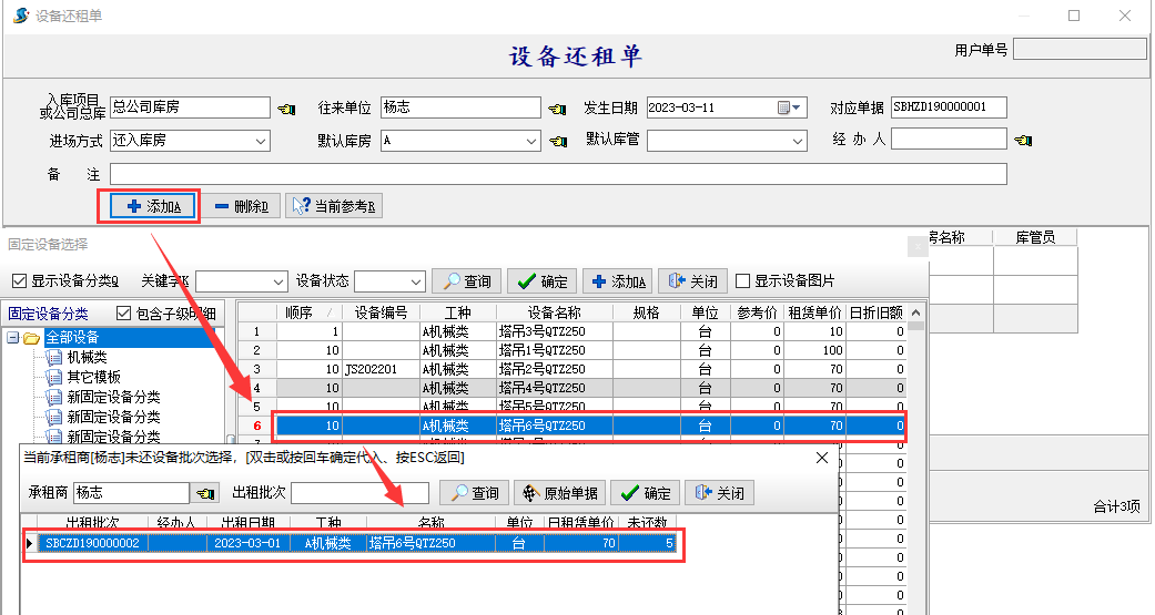 [添加]選擇設(shè)備,從未還批次內(nèi)代入