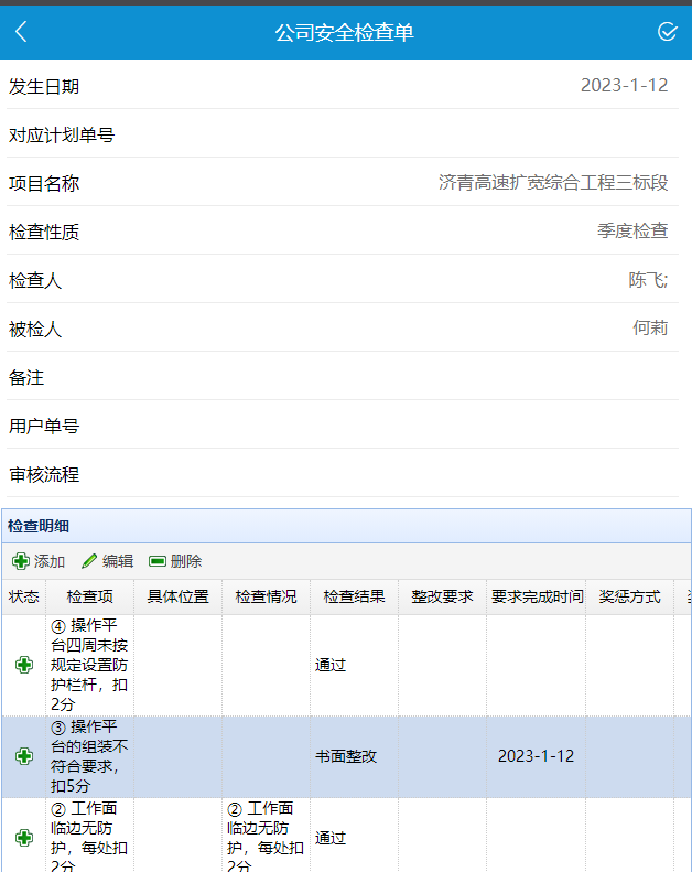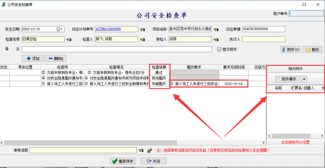 ②檢查結果分為三種類型通過、現場整改、書面整改,其中[通過]為未發現安全問題、現場整改為項目部自行整改不需要書面回復、書面整改為嚴重安全問題由公司下發整改要求和要求完成時間、獎懲方式等項目部需對其進行書面回復