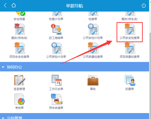 手機端單據入口:手機端主界面【單據填寫】中【公司安全檢查單】