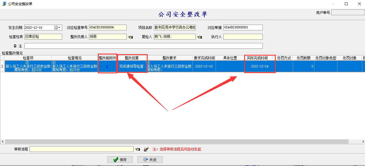 單據(jù)用法:【公司安全整改單】中主要需要注意的地方①整改前附件為公司檢查的問題現(xiàn)場照片;②整改回復(fù)和實(shí)際完成時(shí)間為對公司的回復(fù)內(nèi)容和完成日期(如下圖)