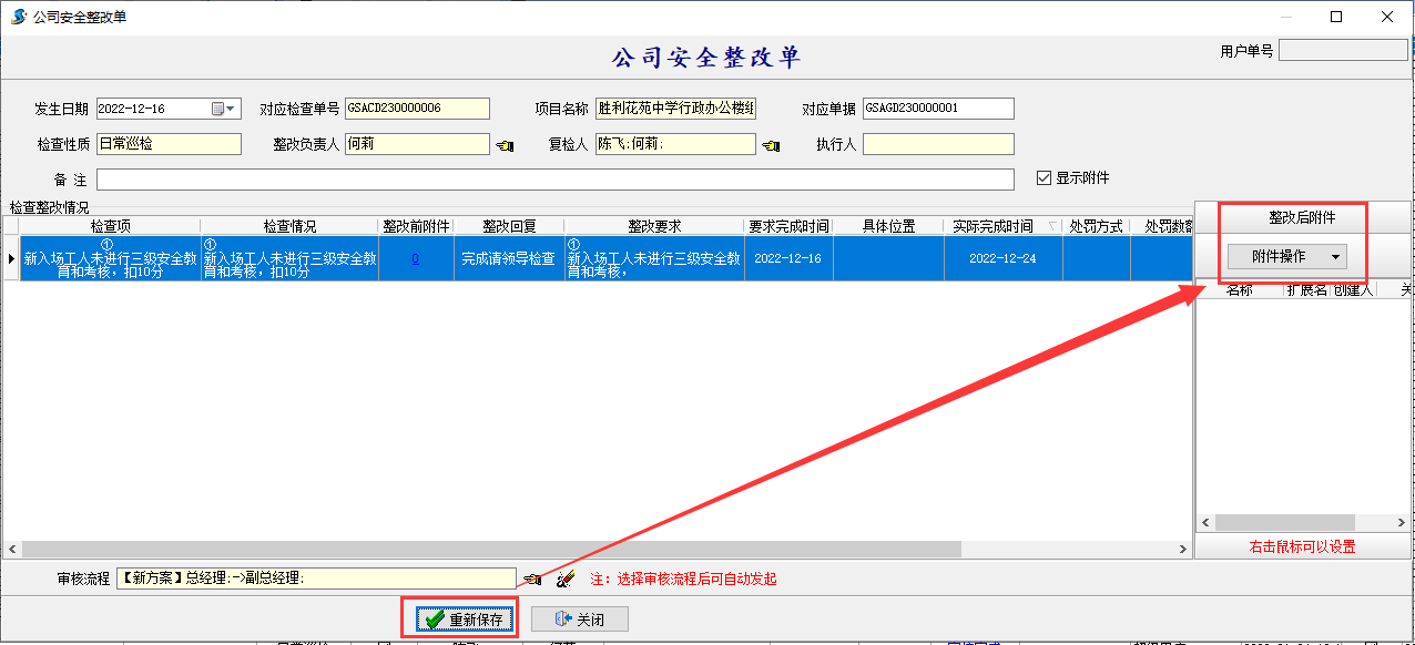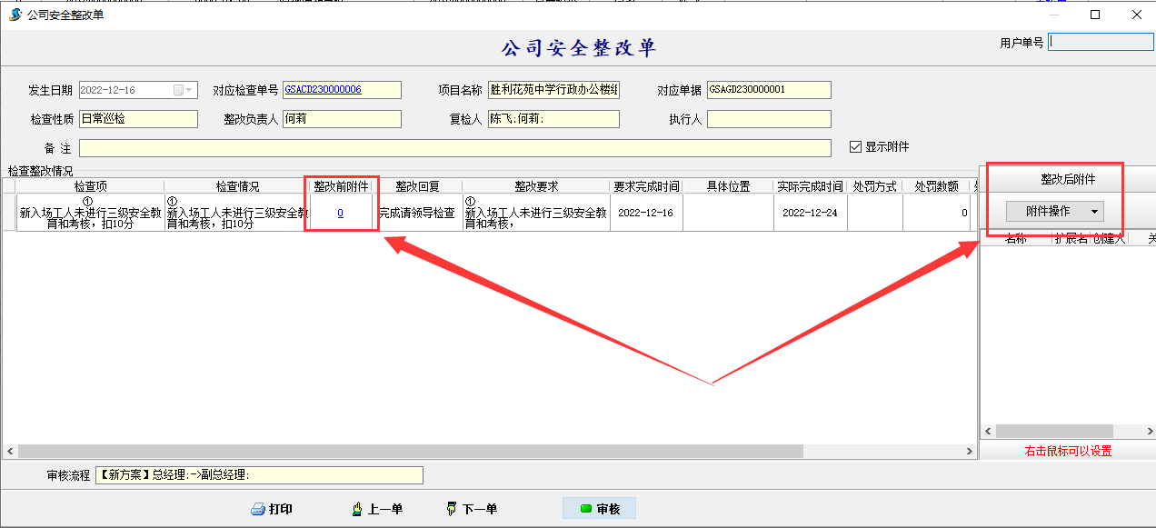 ③單據(jù)選擇審核流程保存后還會(huì)彈出“整改后附件”為項(xiàng)目整改完成后現(xiàn)場照片(如下圖)