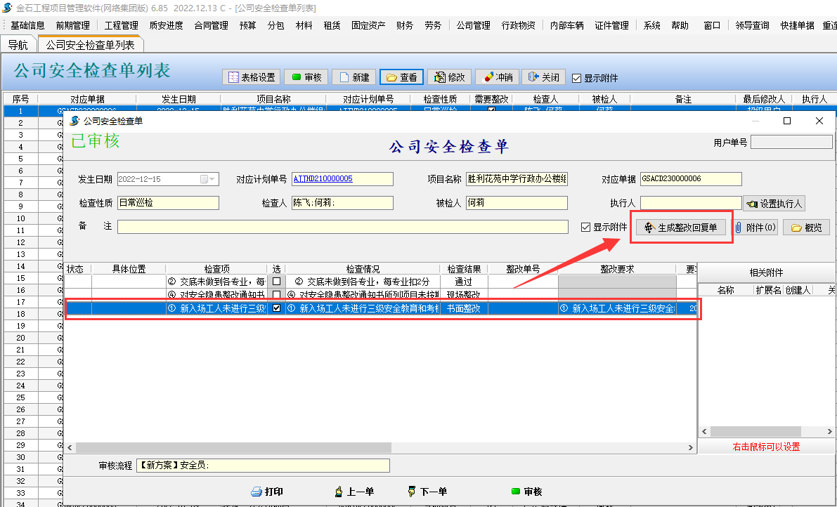 單據(jù)入口:從已經(jīng)審核完成的【公司安全檢查單】中找到整改項(xiàng)“生成整改回復(fù)單”(如下圖)
