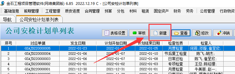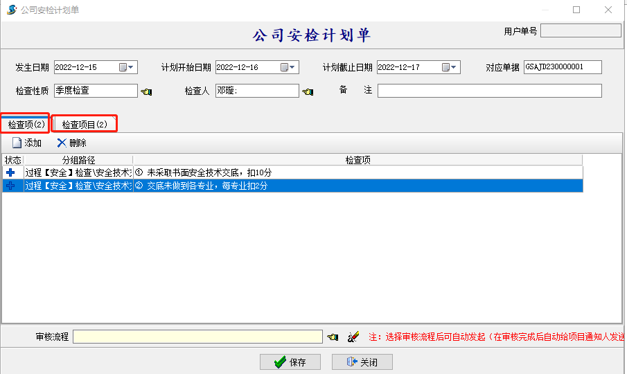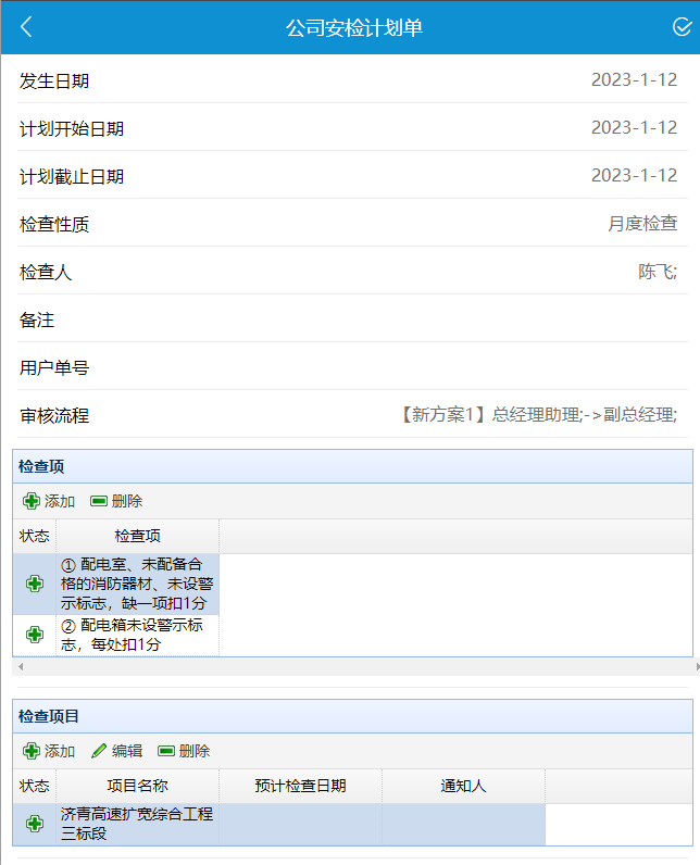 單據(jù)用法:本單主要填寫(xiě)內(nèi)容為檢查項(xiàng)和檢查項(xiàng)目其中檢查項(xiàng)為安全檢查科目,可從安全檢查維護(hù)內(nèi)調(diào)入;檢查項(xiàng)目可設(shè)置多個(gè)項(xiàng)目及檢查日期、通知人為被檢查的項(xiàng)目負(fù)責(zé)人(如下圖)