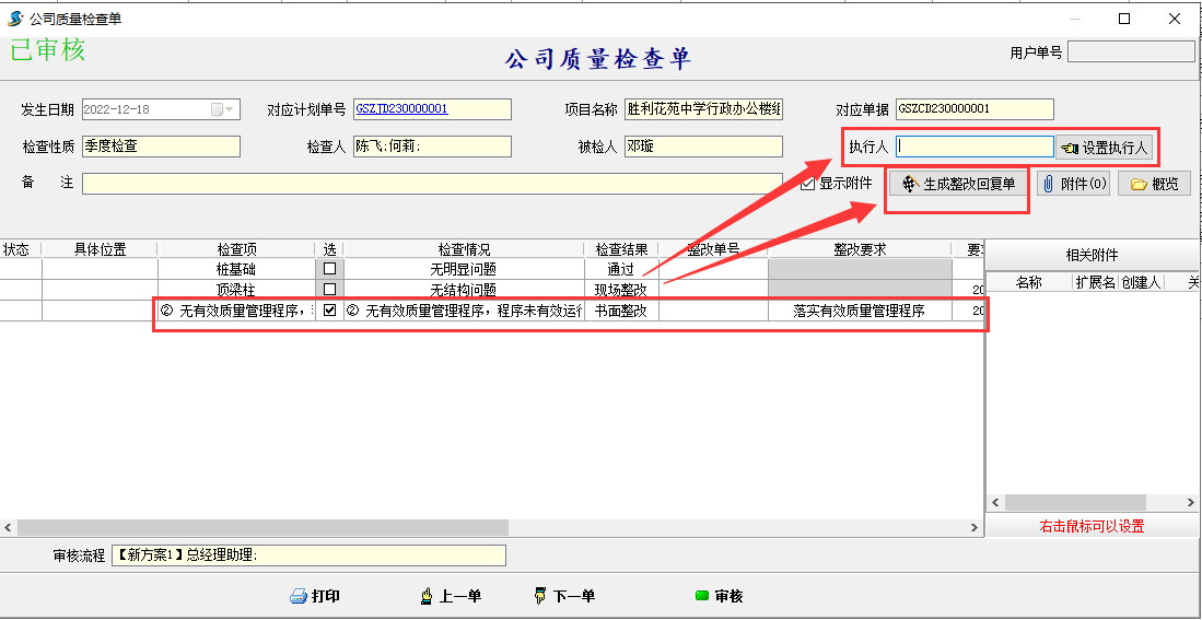 單據入口:從已經審核完成的【公司質量檢查單】中找到整改項“生成整改回復單”(如下圖)