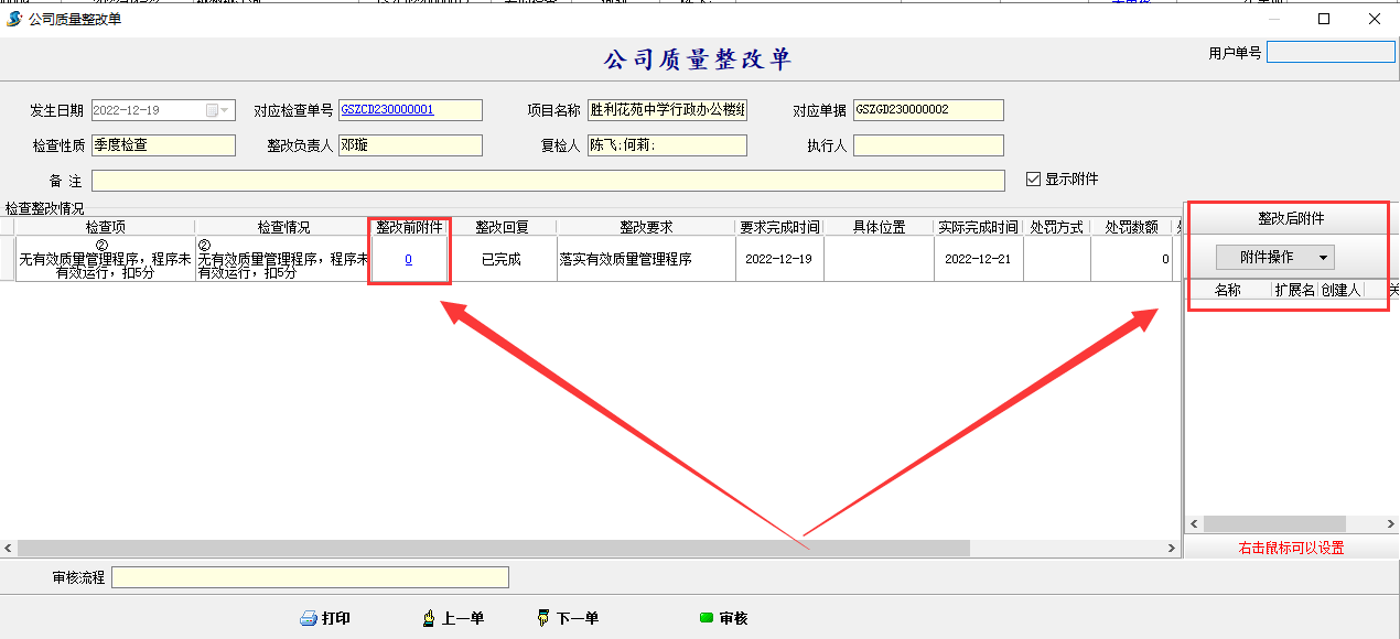 ③單據選擇審核流程保存后還會彈出整改后附件為項目整改完成后現場照片(如下圖)
