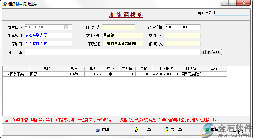 租賃調撥單主要用于租賃材料在不同的項目、班組進行調撥