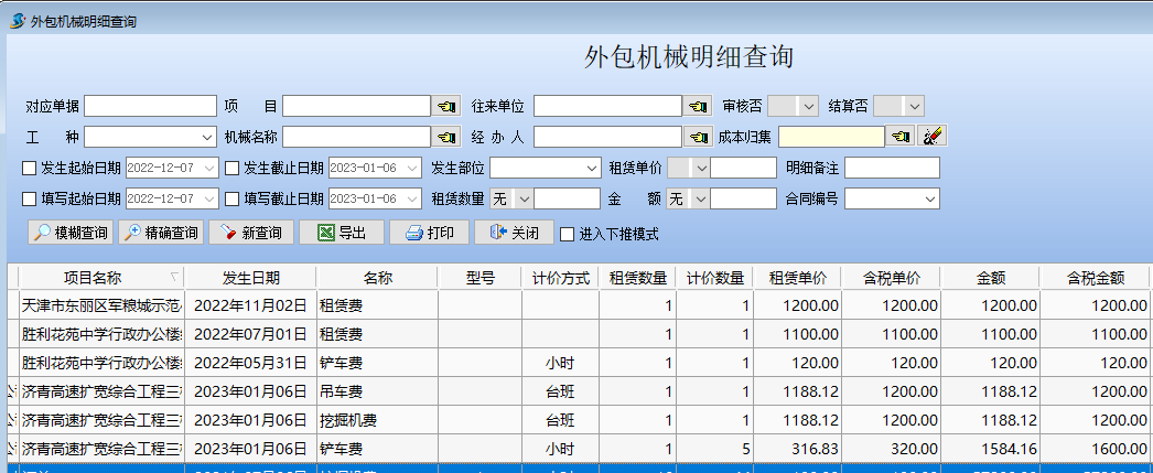 【外包機(jī)械明細(xì)查詢】是用來查詢所有【外包機(jī)械單】中已經(jīng)發(fā)生的機(jī)械費(fèi)明細(xì)。如下圖: