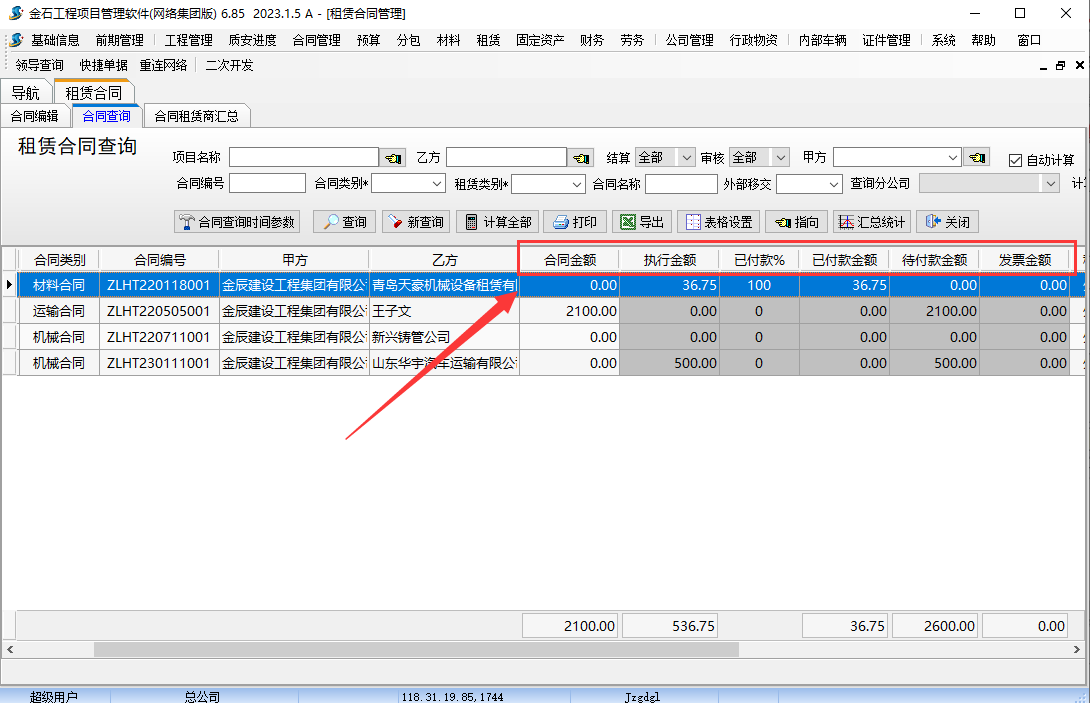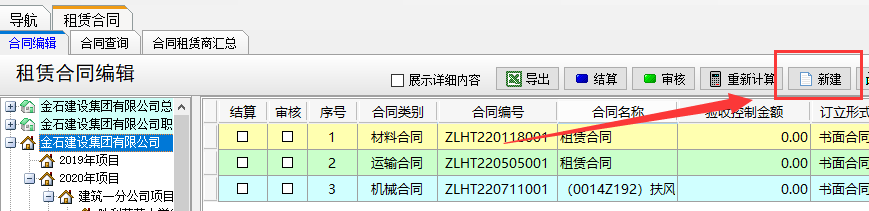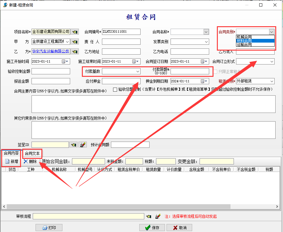 單據用法:①[合同類別]可選擇機械合同、材料合同、運輸合同分別對應租賃機械管理、租賃材料管理、租賃運輸車輛管理