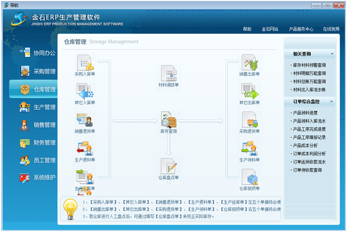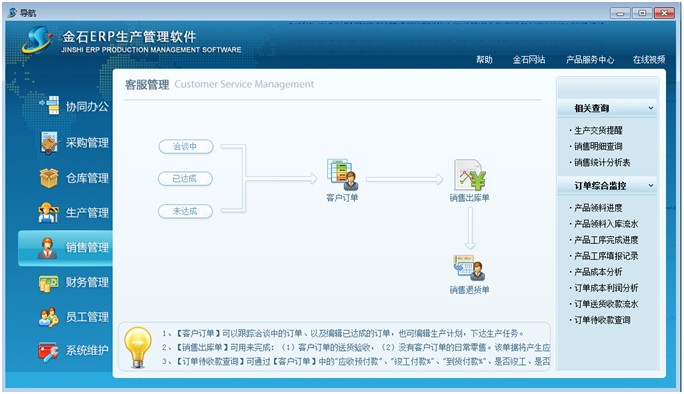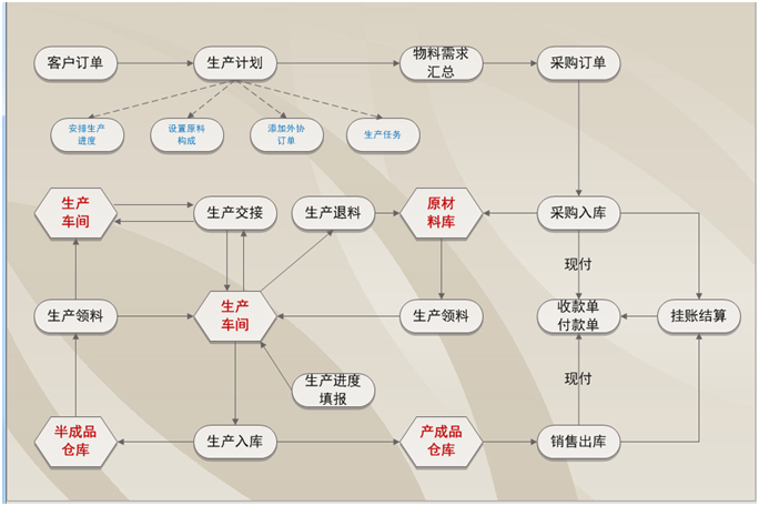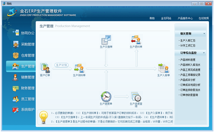 生產管理主要管理由客戶訂單下達生產計劃、生產車間領料、生產工序交接、生產進度填報、生產退料。